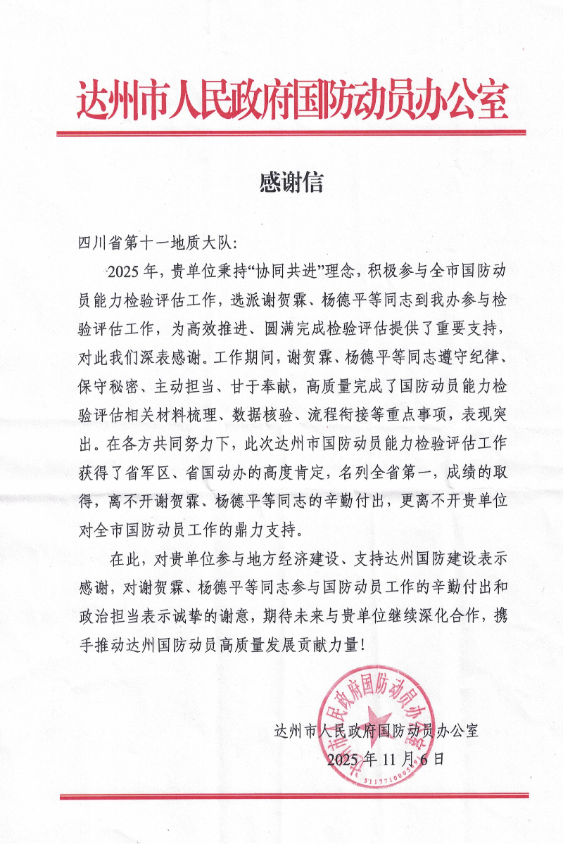 信中指出,在此次检验评估工作的关键时期,十一大队积极响应、主动作为,选派谢贺霖、杨德平等同志前往市国动办参与相关工作,在材料梳理、数据核验、流程衔接等环节提供了有力支持,助力市国动办高质量完成国防动员能力检验评估相关重点事项。此次达州市国防动员能力检验评估工作成效显著,获得省军区、省国动办的高度肯定,并位列全省第一。